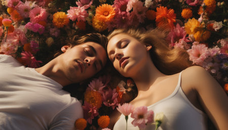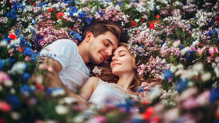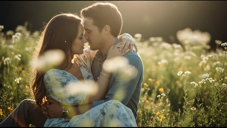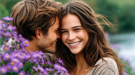 A tender moment shared between a man and a woman, their faces close, smiles radiating happiness. Lush purple wildflowers frame the couple, symbolizing love and the beauty of nature. Outdoor romance, connection, and serene joy are beautifully captured.