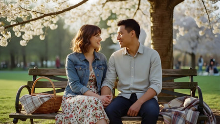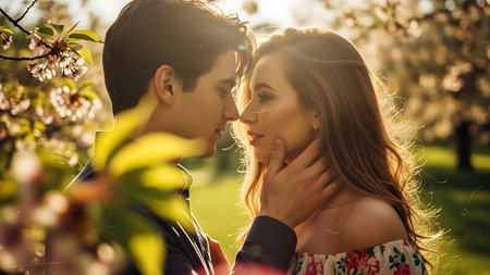 A Sweet Moment Captured: Young Couple Sharing a Delightful Easter Treat Under the Blooming Spring Blossoms