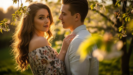 Portrait of a beautiful young couple in the spring garden with blooming trees.