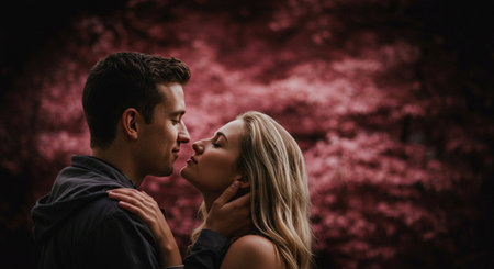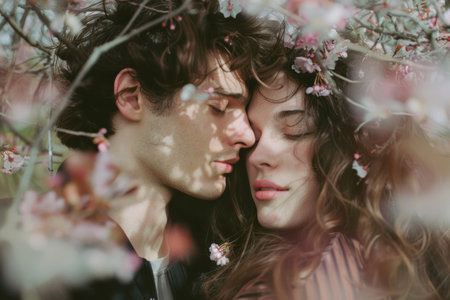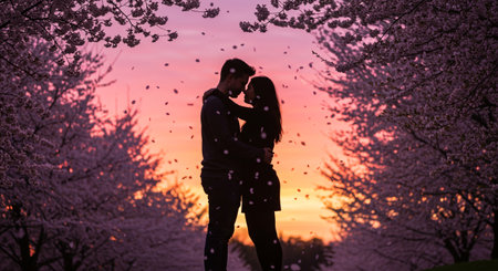 Young couple embraces passionately, surrounded by vibrant pink cherry blossoms in full bloom.
