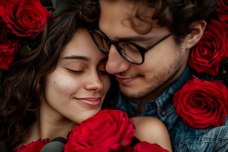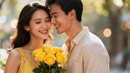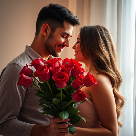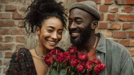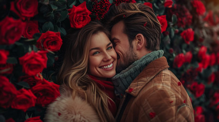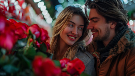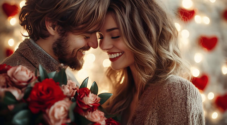 A joyful and loving scene perfect for Valentine's Day, featuring a couple smiling brightly and holding roses, bathed in warm and inviting light.