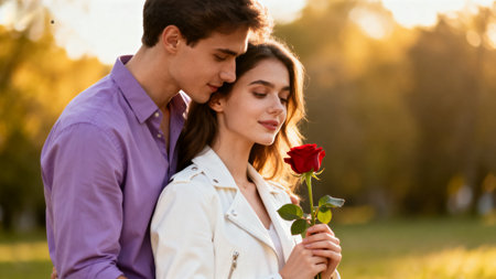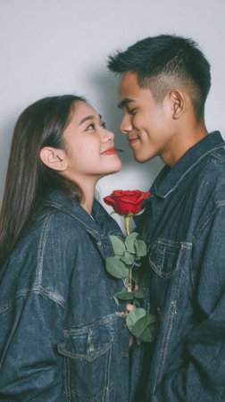 A young couple gazes lovingly at each other, dressed in denim jackets, with a single red rose symbolizing their affection.