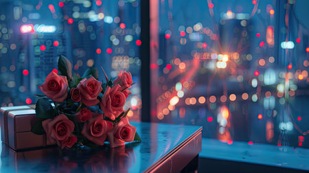 a gift box paired with a bouquet of roses, enhanced with a matte effect, resting on a table, framed by the captivating city night view visible through the window in the background.