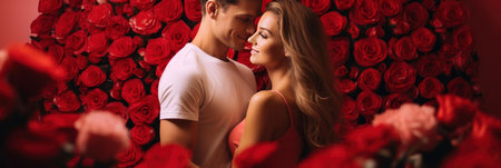 Portrait of a beautiful young couple in love. A man and a woman on a background of red flowers.
