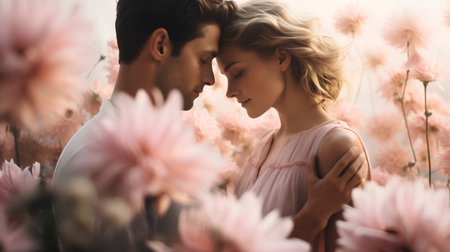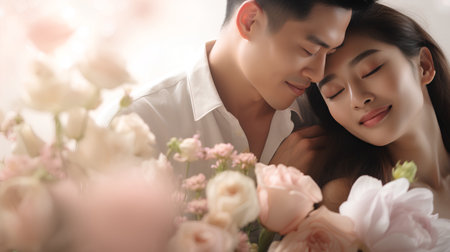 Beautiful asian couple hugging and kissing with flowers background, valentines day concept