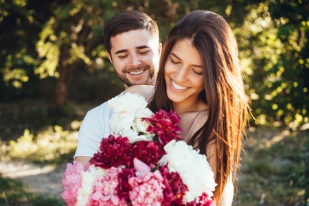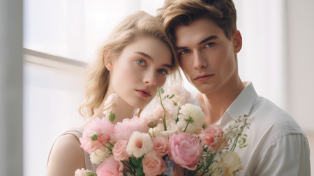 Portrait of a beautiful young couple in love with a bouquet of flowers