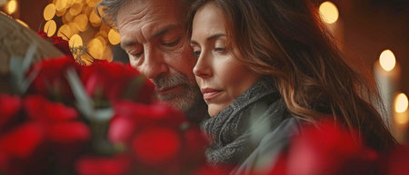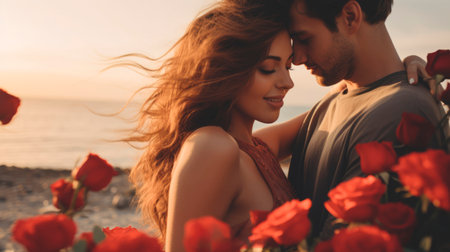 Romantic Couple Embracing by the Sea at Sunset with red roses. Intimate moment. Ideal as postcard for Valentines Day, wedding, anniversary or love story themes. Concept of romance and passion