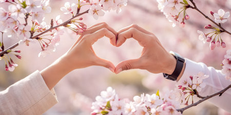 A heartfelt gesture as two hands create a heart shape, framing delicate cherry blossom trees in the background. For Valentine's Day promotions, love-themed blogs, seasonal photography.