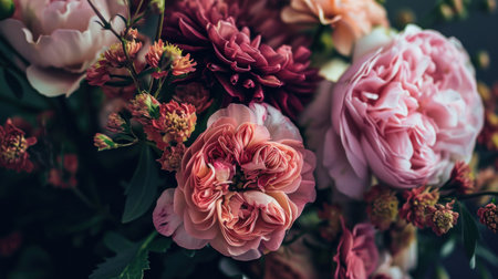 Beautiful bouquet of roses, gypsophila and other different flowers on dark background