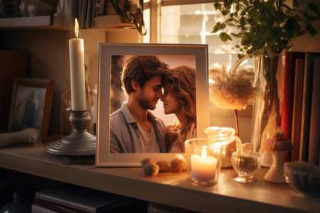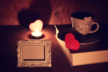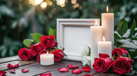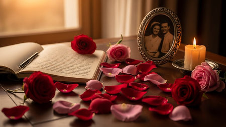 An intimate indoor scene on a wooden table, featuring a lit candle, red and pink roses, and scattered rose petals. An open book with handwritten script lies next to a framed oval of a couple. A pen rests on the book, suggesting a moment of reflection or writing. The warm lighting creates a cozy and sentimental atmosphere.