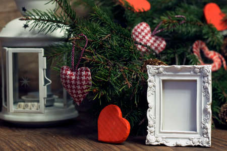 Love card template with blank photo frame heart shaped on the red hearts on background