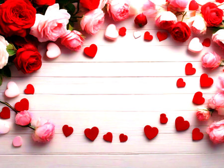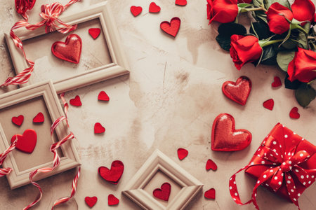 Vibrant red roses encircle an empty space, accompanied by small gift boxes and heart shapes, creating a romantic setting perfect for love letters or special occasions.