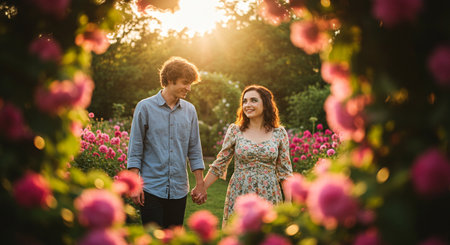 Romantic couple enjoying sunset in a field, with wildflowers and a floral crown, creating a serene atmosphere of love and togetherness in nature