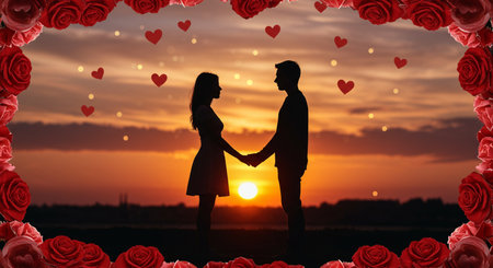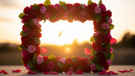 A square frame constructed from red and pink roses with green leaves, set against a soft sunset sky with rose petals gently falling.
