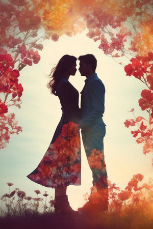 Silhouette of a loving couple hugging and kissing on a background of flowers.