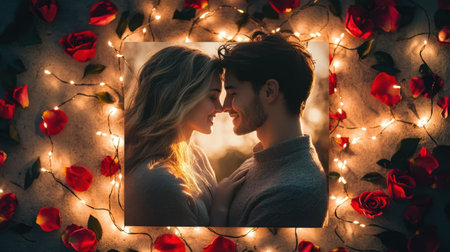 A romantic Valentine's Day card with a photo insert, surrounded by a frame of fairy lights and rose petals.
