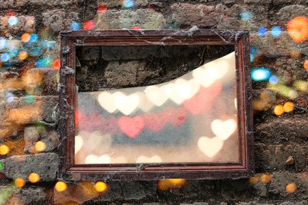 black silhouette kissing a couple of guy and girl, above them three red hearts, around the pair glows garland, in the background a white brick wall