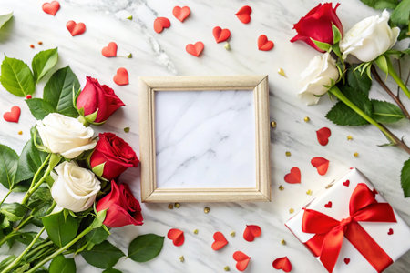 Valentine's Day roses, empty frame, gift, hearts on marble