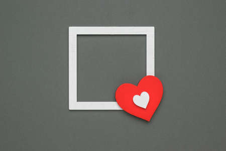 Two wooden hearts and a white wooden frame on a gray background. The concept of Valentine's Day. flat lay.