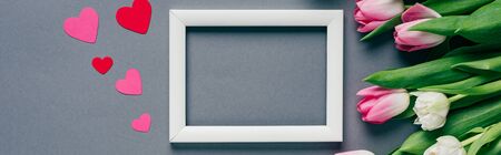 Panoramic shot of white frame with paper hearts near bouquet of tulips on grey background