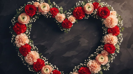 A heart-shaped wreath crafted from red roses, pink carnations, and delicate white baby's breath on a dark, textured...