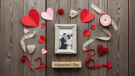 A beautifully arranged Valentine's Day display featuring hearts, ribbons, and a framed photo of a couple. Perfect for celebrating love and affection.