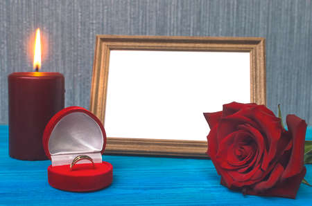 Wedding ring in a gift present box and empty photo frame of a loved one copy space and red rose flower on wooden table background. Marriage offer template. The proposal concept.