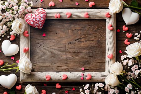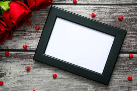 Top view of photo frame, rose and heart on wood table with copyspace for feelings love, wedding, anniversary and valentine's day.
