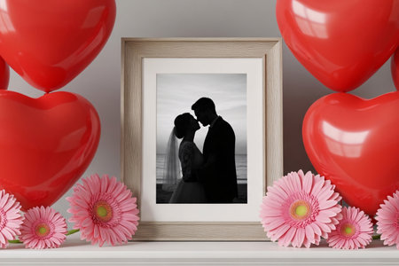 Heart balloons and gerbera flowers arranged around a vintage style wedding picture to highlight the concept of eternal love and memory.