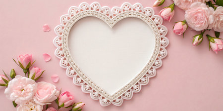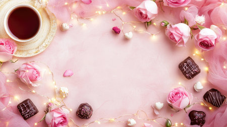 A soft pink backdrop features delicate roses, chocolates, and a tea cup, creating a romantic setting perfect for celebrations or cozy moments.