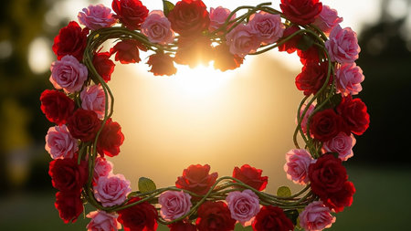 showing heart shaped wreath of red and pink roses against a golden sunset sky with soft bokeh background and sunlight rays. resolution