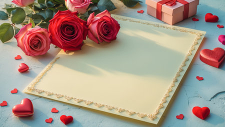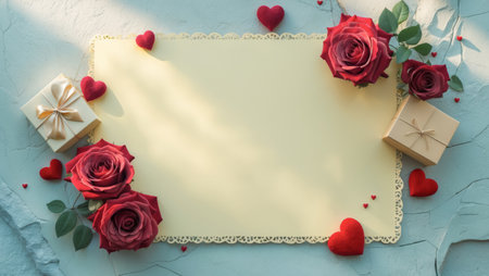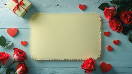 Bright red roses surround a blank card on a pastel blue surface, complemented by heart-shaped decorations and a small gift, setting a romantic tone for celebrating love.