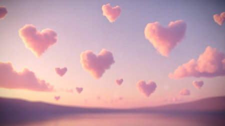 Pink heart shaped clouds floating in a soft pastel sky at sunset over a serene landscape