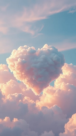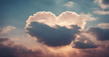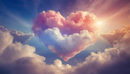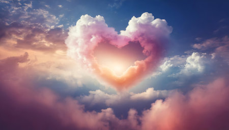 A serene and picturesque scene featuring a heart shape formed by soft, pastel-colored clouds against a clear sky. The heart is composed of delicate cotton-candy-like clouds, with shades of pink, blue, and purple, creating a whimsical and romantic atmosphere. The background showcases a gradient sky transitioning from a warm orange near the horizon to a soft blue as it ascends, enhancing the dreamy ambiance.