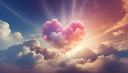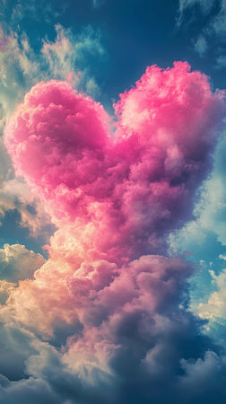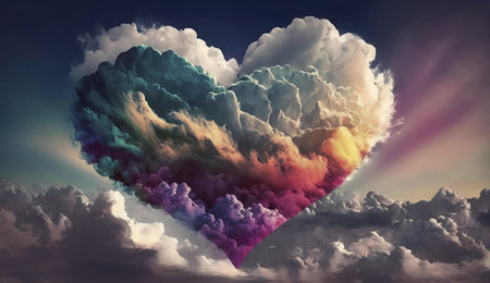 Discover an enchanting Valentine's Day scene featuring a vibrant, colorful heart set against soft, ethereal clouds. This abstract background evokes a dreamy and romantic atmosphere, perfect for