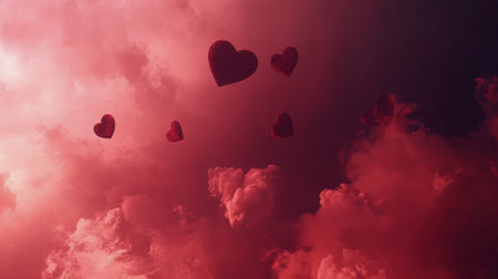 Small red hearts drift through the air, set against a bright red backdrop, enhancing a feeling of love and celebration. This visually striking display evokes emotions of affection and joy.