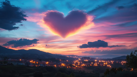 A stunning display of nature as a heart-shaped cloud forms during sunset. Below, the lights of a tranquil town shimmer, surrounded by hills and layered colors in the sky.