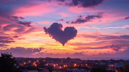 A striking heart-shaped cloud appears against a vibrant sunset sky, illuminating a coastal town below. City lights twinkle as day transitions to evening, creating a romantic atmosphere.