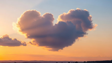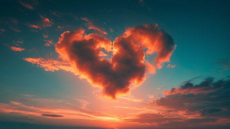 Vivid sunset revealing heart-shaped clouds over a serene landscape creates a romantic atmosphere in the evening sky