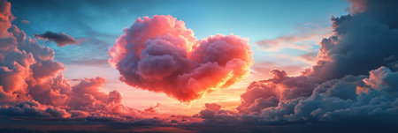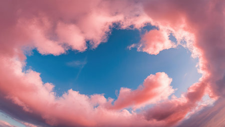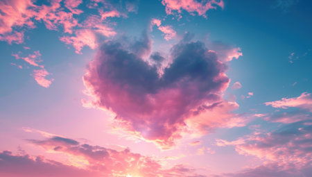 A vibrant heart shaped cloud formation in shades of pink floats in a bright blue sky. This captivating sight is set against a backdrop of soft clouds during a beautiful sunset.