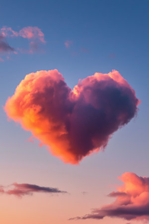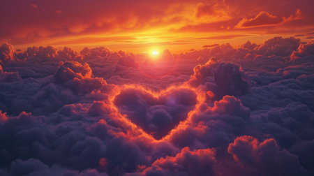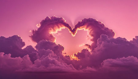 Heart-shaped clouds illuminate the sky at sunset, creating a romantic atmosphere