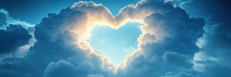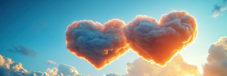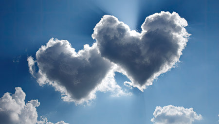 Two fluffy white clouds form heart shapes against a vibrant blue sky. Sunlight streams through the gaps, creating highlights and shadows. The image showcases natural textures and a soft, diffused lighting. It is suitable for use in various design projects or as an illustration for themes of love and nature.