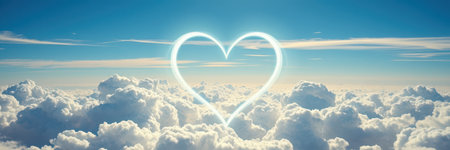 A heart-shaped image appears in a vast, blue sky above fluffy white clouds