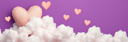 Numerous fluffy, pink clouds shaped like hearts float amidst a soft, light-pink and blue sky