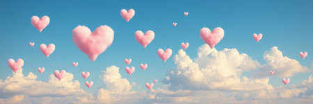 Numerous fluffy, pink hearts float amidst soft white clouds and a vibrant blue sky
