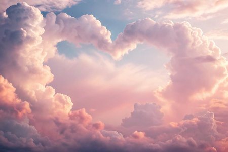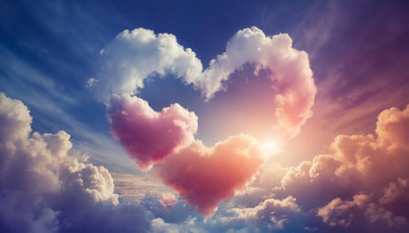 Heart-shaped clouds create a romantic sky at sunset, showcasing natures artistry in soft hues of pink and blue