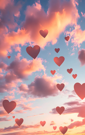 A serene sunset sky filled with floating hearts, evoking feelings of love, tranquility, and romance in a whimsical atmosphere.