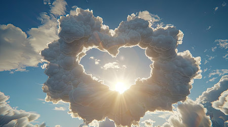 A stunning heart-shaped cloud bursts with rays of sunlight against a clear blue sky, creating a picturesque and serene scene that evokes feelings of love and hope.