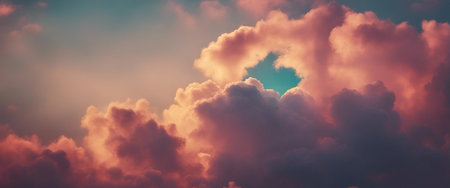 Beautiful view of pink clouds in vibrant sunset sky. Clouds are fluffy and full of light, creating stunning visual display. Dramatic unreal sky with cumulus and stratus clouds in atmosphere. AI art.