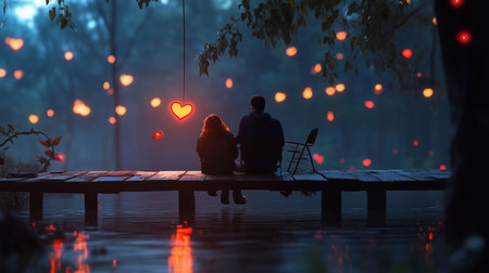 A couple enjoys a serene evening by the lakeside, illuminated by heart-shaped lights in a romantic atmosphere